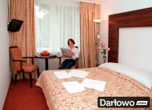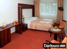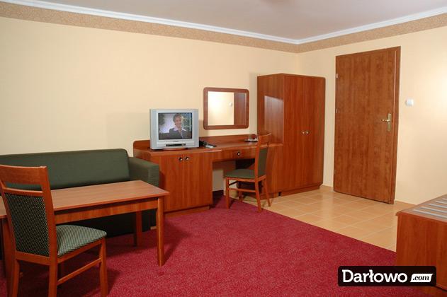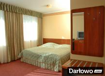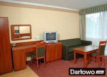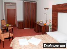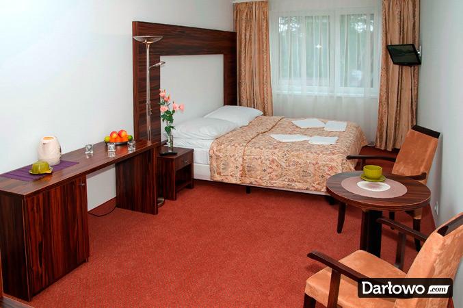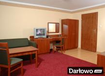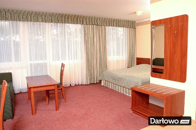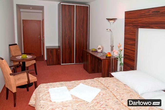Dwa łóżka – zestawione w łóżko małżeńskie, szafki nocne, biurko/toaletka w pokojach 3-osobowych, stolik, krzesła, szafa z wieszakami na okrycia wierzchnie, lustro, chłodziarka hotelowa.